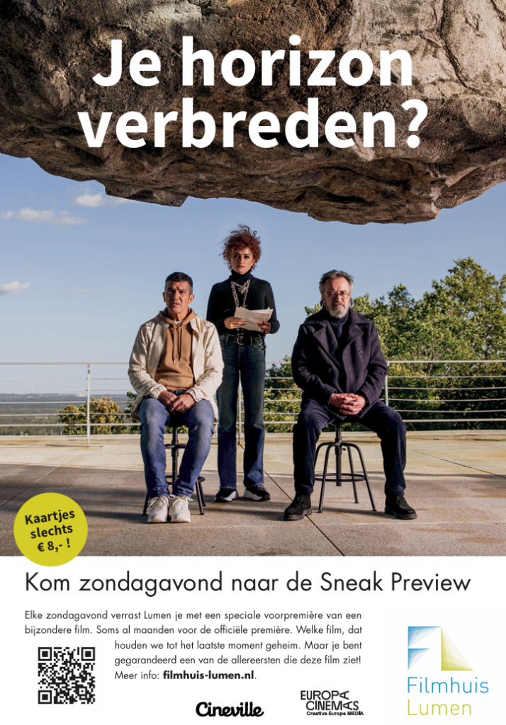 Iedere zondagavond rond 20.30 uur vertonen we in Lumen een verrassende, speciale voorpremière van een bijzondere film die pas weken of maanden later in Nederland officieel in première gaat. Welke film we voor je draaien, houden we tot het allerlaatste moment geheim. Maar wat zeker is: jij bent een van de allereersten die deze film ziet!